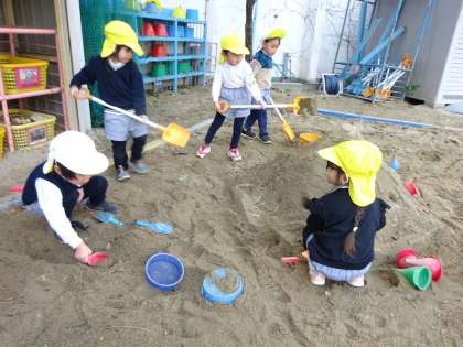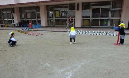 今日、いつものように3クラスでマラソンをした後、園庭には3歳児ひよこ組だけになりました。「では、貸し切りでひよこ組だけで遊びましょう」ということで、しばしの時間はひよこ組のみ。