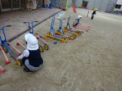 それが楽しく、その後は、縄遊びをするときも、ちゃんと、ひよこ組建築スケーター駐輪場にスケーターを停めてから、「入れて!」と来ていました。