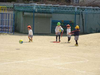 今、あんなに賑やかだった幼稚園がとても静かです。その静かな園庭で、暖かい日差しを浴びて、預かり保育の子どもたちが「貸し切り状態」でのびのびと遊んでいました。