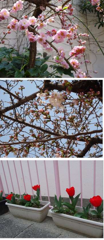 園庭では、寒い中を咲いていた梅も終わりかけになってきましたが、今度は桜がちらほらと咲き始めました。チューリップも開花し、これから背を伸ばそうとしています。