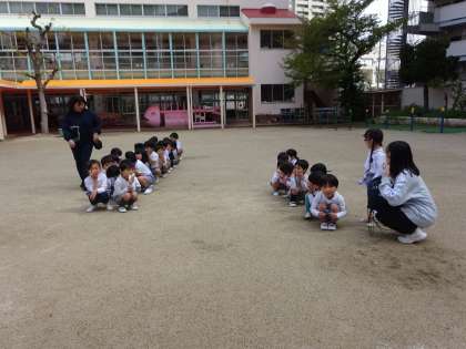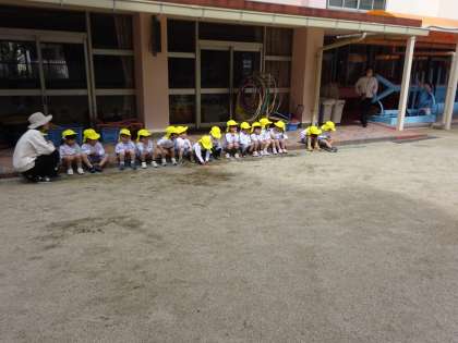 3歳児ひよこ組は、4歳児りす組、5歳児らっこ組の避難訓練の様子を見せてもらうために、先に園庭で待機!