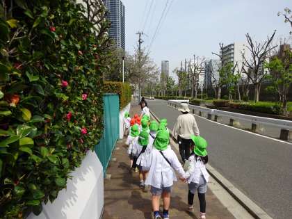 今日の午後、5歳児らっこ組と4歳児りす組で、園外散歩にでかけました。