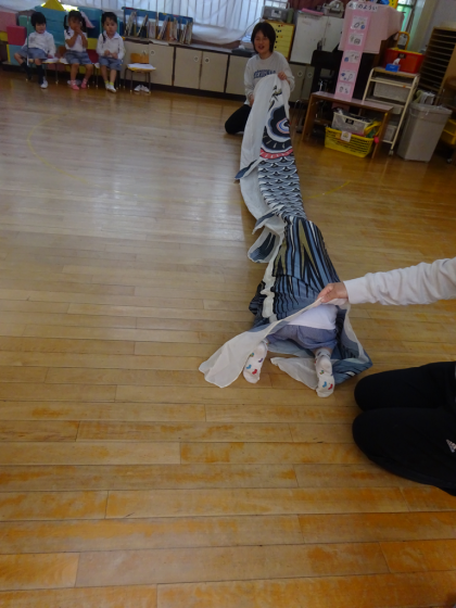 いつも大空を泳いでいるこいのぼりが、3歳児ひよこ組の部屋にやってきました。