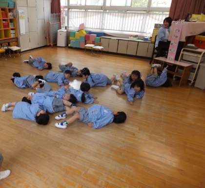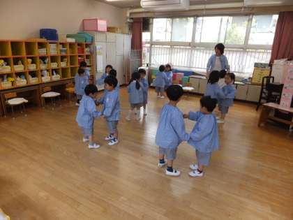 園庭で遊んだ後、保育室で友達となかよし遊びをしたり、ダンゴムシになって体を動かして遊んでいました。