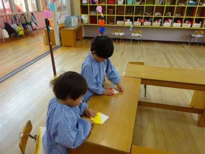 保育室に帰ってからは、4歳児りす組の子どもたちは折り紙をしていました。