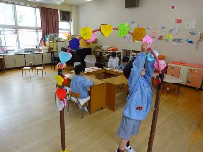 これまでに先生と一緒に折った経験から、自分たちで教え合いながらイチゴを折り、誕生会の誕生児入場のアーチづくりをしていました。
