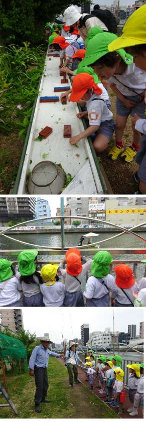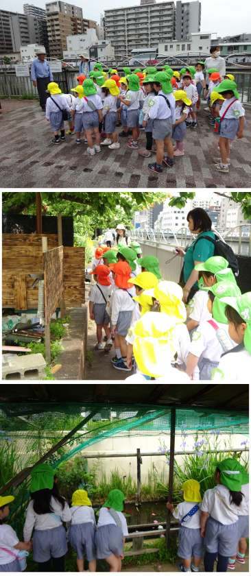 アゲハの幼虫を見たり、池の金魚やカエルをみたり、(大きい金魚なので、ひよこ組の子どもは「鯉!」と言っていました)、流れる水で遊んだり、川を行き交う船を見たり・・・と、楽しいことがいっぱいでした。