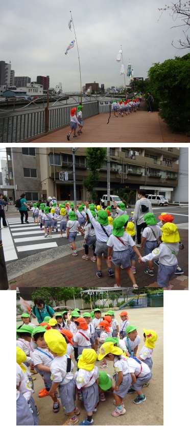 そして、こいのぼりに見送られて、らっこ組のリードで安全に幼稚園に帰ってくることができました。