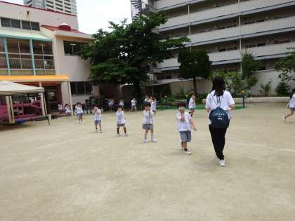 火災が起こった設定で、みんなハンカチをしっかりと口に当てて、5歳児らっこ組は非常階段から、4歳児りす組と3歳児ひよこ組は扉から安全に避難することができました。前回、ひよこ組は、非常ベルを聞き、様子を見るだけでしたね。