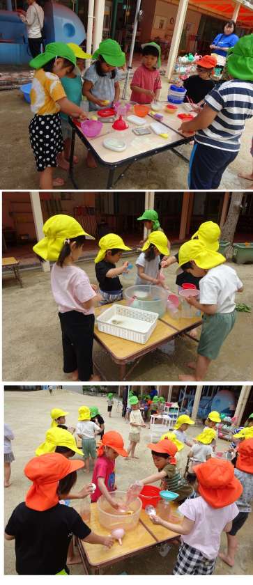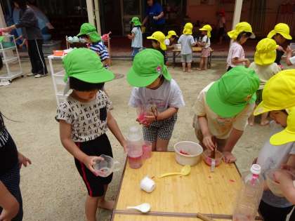 色水遊びでは、3歳児ひよこ組と4歳児りす組は、「色がついている水」が楽しく、何度も何度も水の入れ替えを楽しんでいました。