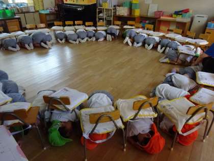避難訓練(西道頓堀コーポ) 公開日 2025/06/19 更新日 2025/06/19 幼稚園日記 今日、地震・津波を想定した避難訓練を行いました。 非常ベルを聞き、放送の指示ですぐに丸くなったり、椅子の下に隠れたりして、頭を守っていました。 その後の指示で、お隣の西道頓堀コーポまの3階までに避難し、静かに話も聞き、今日も自分の命を守って、行動できました。 ご家庭でお話をされているのか、地震や津波の恐ろしさを知識として知っている子もいましたので、これを機会に、お話をしてみてください。 いいね(0)