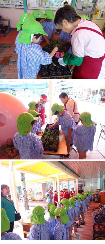 大雨の中を西区役所の方、公園事務所の方、西区緑化会の方々が幼稚園にお越しくださいました。