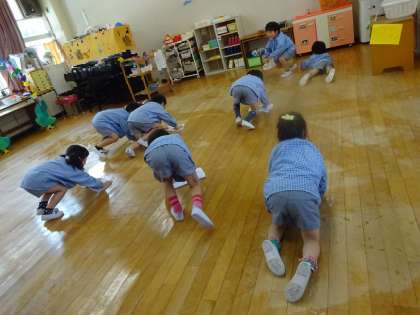 5歳児らっこ組は、自分の保育室だけではなく、遊戯室や廊下、ステージまで率先して拭いていました。(すみっこまで、気付いて拭いていましたね)