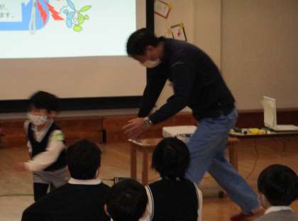 11日、「もうすぐ1年生安全安心GO」というタイトルで1年生になる年長さん向けのお話がありました。今はほとんど保護者と行動していますが、小学生になると登下校は友達と一緒か時には一人で行動する場合もあります。交通安全のルール、防犯のために気を付けること、防犯ベルの使い方や、危ない時の逃げ方など、パワーポイントや実技指導で分かりやすく教えていただきました。「学校から家までに『こども110ばん』の旗がある家がどこにあるか見ておいてね」という宿題もありました。子どもたちは真剣に聞いていました。「たくさんの人に守られているけれど、自分でできることを覚えておく」ことを知るいい機会になりました。