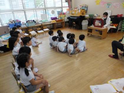 大型紙芝居や絵本、エプロンシアターなど、たくさん読んでくださり、子どもたちはすごく喜んで、楽しそうにお話を聞いていました!