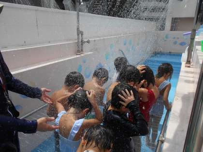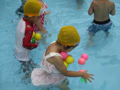 プールでは、毎日、子ども達の楽しそうな歓声が響いています。友達と一緒に、ボールの的入れをしたり、音楽に合わせて踊ったり、流れるプールをつくったり、水の感触を存分に楽しんでいます。「シャワー、がんばったよ」「水の中に顔をつけたよ」「浮き輪で泳いだよ」など、頑張ったことを、にこにこ顔で教えてくれる子ども達です。水と仲良しになってくれているのが、嬉しいですね!