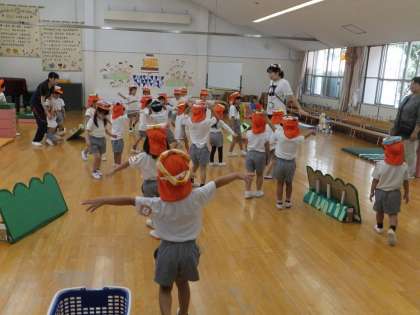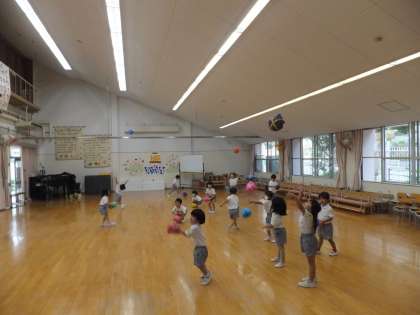 ひよこ組、りす組は、ボールやリングを投げたりバランスをとったりしてたくさん体を動かして遊んでいます。
