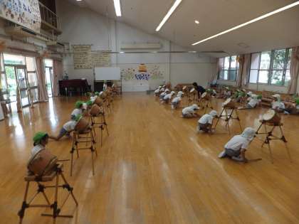 らっこ組は、太鼓や鳴子の演奏やダンスを楽しんでいます。