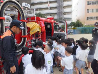 当日は西消防署より、消防車1台と3名の消防隊員の方が幼稚園に来てくれました。