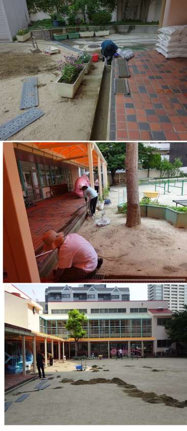 それでも、汗だくになりながら、側溝にあったものを取り除き、砂を乾かし園庭を整地しました。