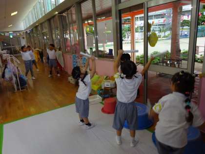 そして、3歳児ひよこ組はらっこ組の和太鼓のCDをかけて、例のごとくたらいを叩いていたのですが、その姿は“完全コピー”でした。そばで、見ていたらっこ組から「上手やな」とのお褒めの言葉をかけてもらっていました。