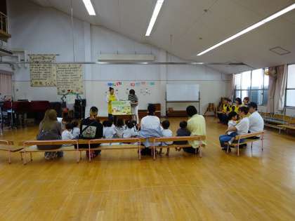 その後、今日、幼稚園にご招待していた日吉小学校の絵本サークル「おひさん」の方が、くまクラブとひよこ組の子どもたちに、絵本や紙芝居の読み聞かせをしてくださいました。