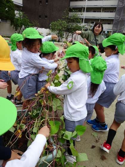 今日は、5歳児らっこ組が幼稚園でできたおいもを掘りました。