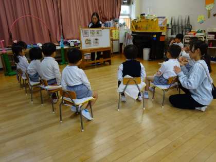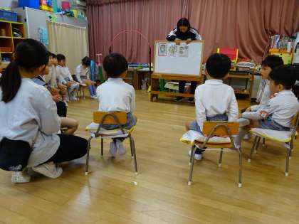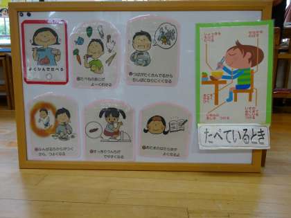 保健指導 公開日 2025/11/07 更新日 2025/11/07 幼稚園日記 毎月、養護教諭が子どもたちの実態に合わせて、保健指導をしています。 今月は、食事の仕方の中から、「姿勢について」「よく噛んで食べる」という内容で子どもたちに話をしました。 姿勢については、毎日、担任からも指導をしています。 しかし、改めて「よく噛んで食べる」ということに興味をもち、それがどんな大切なことに繋がるのかを知って、よく話を聞いていました。 いいね(0)