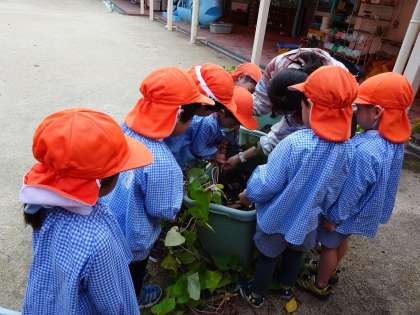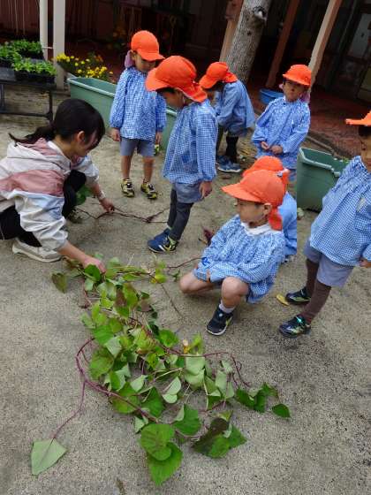 そこで園庭に広げると、茎や葉の部分と根っこのおいも部分を興味深く見ていました。(広げるころには、何個かのおいもは採ってしまっていました・・・・・笑)