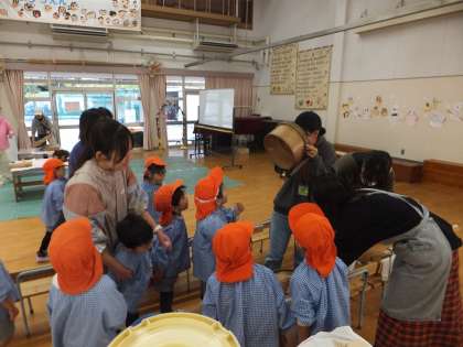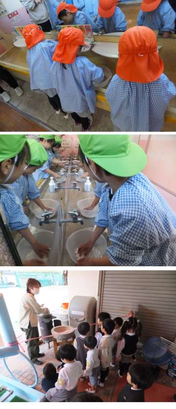 5歳児らっこ組と4歳児りす組は、もち米を研ぐお手伝いをして、このもち米がお餅になることに期待をしています。