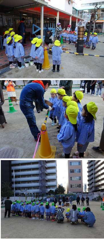 登園した子どもたちは、かまどが気になり、立ち止まって見ては、「けむりの匂いかな」「線香花火みたい!」という声をあげ、後ろ髪を引かれつつ、先ずは保育室へ・・・