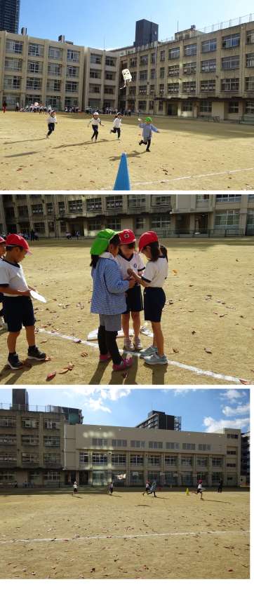 校庭では、待っていてくれた1年生から歓迎の言葉をかけてもらい、わくわく感がいっぱい。たこあげの始まりです。