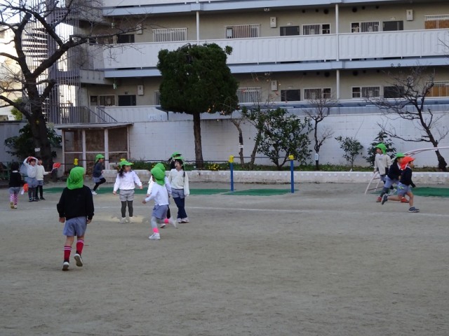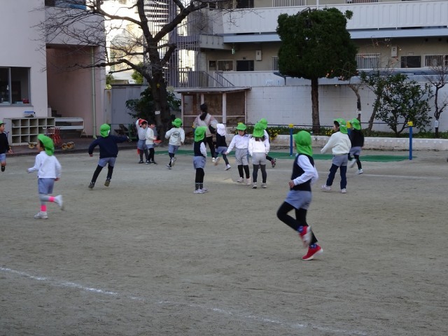 クラスで、また3歳児ひよこ組と一緒にする氷鬼と違い、追いかけてくるスピードも、逃げるスピードも速いので、りす組の子どもたちの運動量も大きかったようです。 よく体が温まったかな・・・