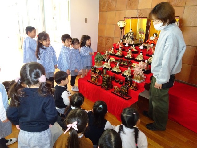 幼稚園の玄関に雛人形が飾られています。