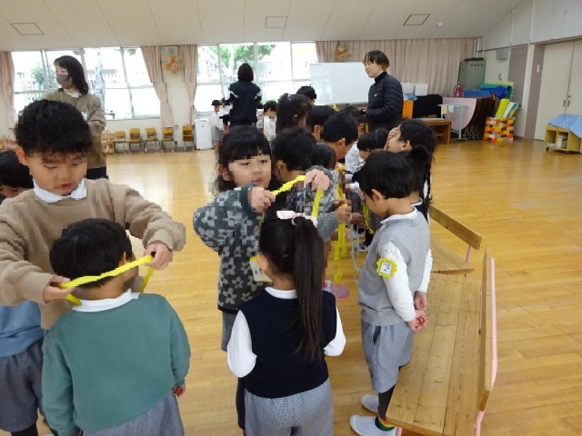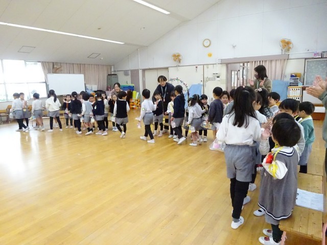 今日は、5歳児らっこ組と、4歳児りす組・3歳児ひよこ組とのお別れ会をしました。