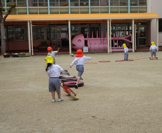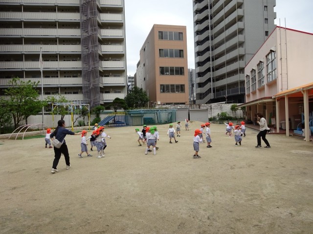 初めは泣いたり、保護者と離れなかったりしていた子どもたちも、5歳児らっこ組にお世話してもらって園庭へ!