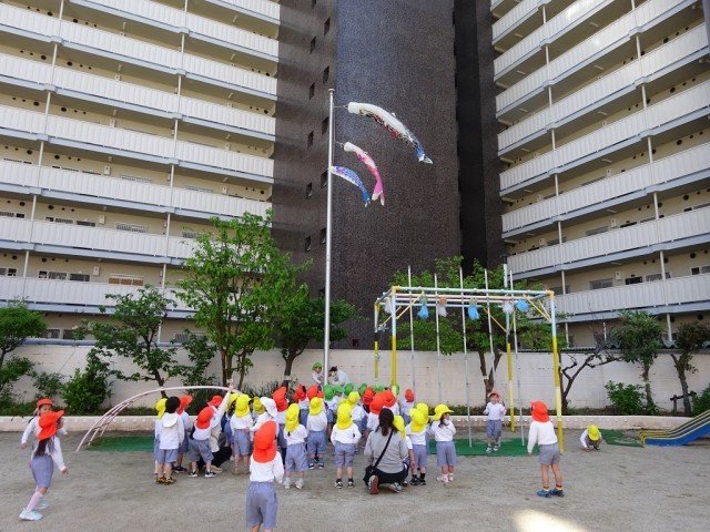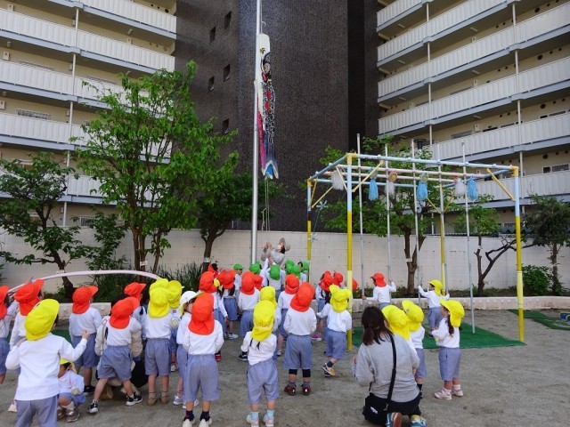 昨日、5歳児らっこ組がリードしながら、みんなで体操をした後は、こいのぼりをあげました。