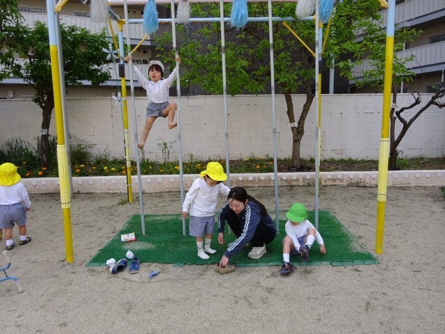 今日もこいのぼりが泳ぐ下で、各クラスが入り混じって遊んでいましたよ!