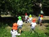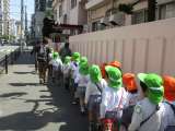 年長児が小さい組さんと手をつないで、アドプトリバーに行きました。花壇の木や花を見...