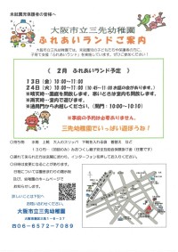 2月は13日(金)、24日(火)にふれあいランドを実施します。今年度は、2月で終わりになります。令和8年度は、5月から実施予定です。みなさん、遊びに来てください。お待ちしています。