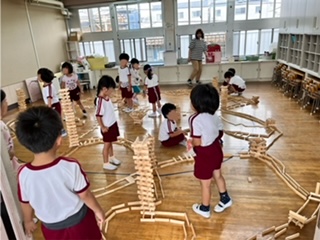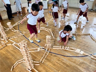 つみきであそぼう! 公開日 2024/06/19 更新日 2024/06/19 幼稚園日記 今日は朝から大雨でしたね。 空組は、幼稚園にある積み木を全部使って、お部屋いっぱいに町を作って遊びました。 最初は、誰が1番高いタワーを作れるか?道をどこまで長くできるか?と遊んでいましたが、だんだん一人一人の作ったものが繋がって、一つの町になっていきました。 「みんなでつくったから、すごいなあ!」と、みんなで作りあげた空組の町に大満足の空組でした。 いいね(0)