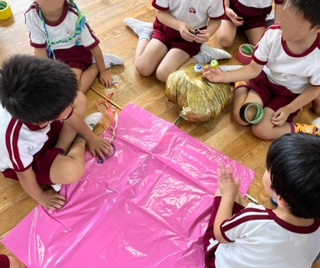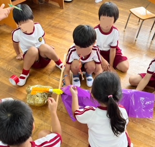 「キラキラしてたらカラスは逃げていくんやで」「めっちゃ怖い顔にしよう」など、みんなで意見を出し合いながら協力し合ってつくり上げました。