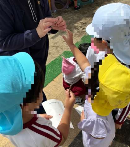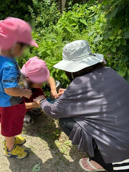 お庭で見つけたいろいろな生き物との関わりも楽しみ、仲良しになりました。ダンゴムシは人気者。毎日水をシュッシュッと吹きかけ、お世話をしていたら、赤ちゃんダンゴムシが生まれて、びっくり。可愛かったね。