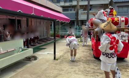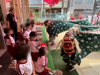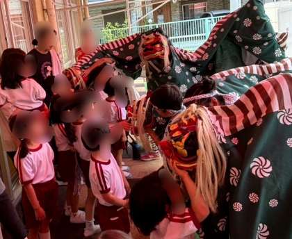 夏休みに入り、幼稚園に神輿と獅子舞が来てくれました。かき組の子どもたちは、びっくりして泣き出す子どももいましたが、突然の訪問に大喜びしていました。獅子舞に頭をがぶり。無病息災、元気に過ごせますように。