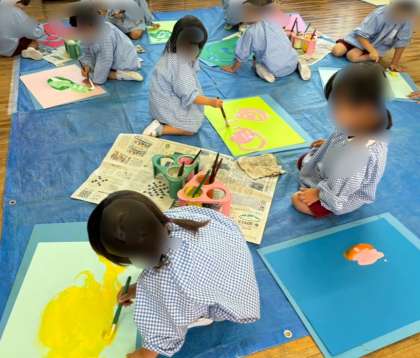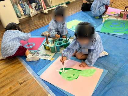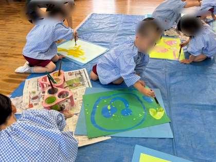 二学期に入って、久しぶりに絵の具で絵を描きました。紙いっぱいにお話をしながら、筆を動かして描くことを楽しむ姿がありました。思いを表現するお話の過程がとても大切です。