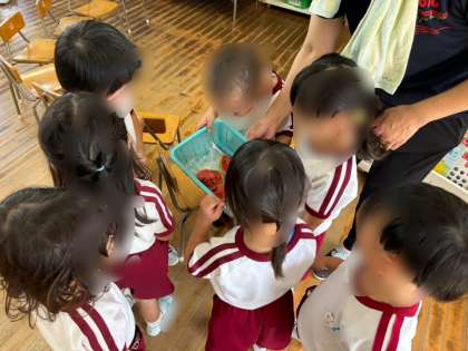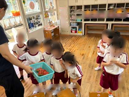 スイカ 公開日 2024/10/01 更新日 2024/10/01 幼稚園日記 空組が育てたスイカが、9月になっても育っていました。収穫して割ったスイカを桃組も見せてもらいました。形、色、種、匂いなど、五感を使って、スイカを味わっていました。自然に興味津々の子どもたちです。 いいね(0)