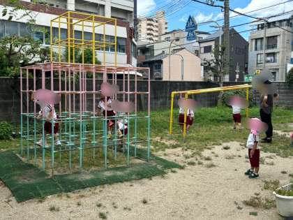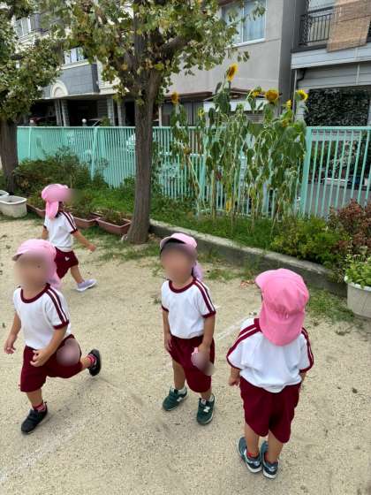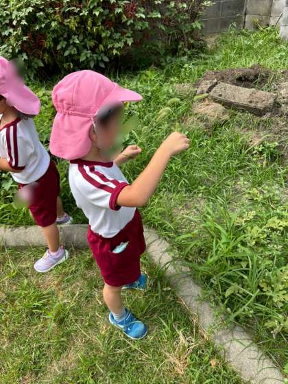 残暑厳しい中、少しずつ、朝晩が涼しくなってきました。運動会に向けて、体を動かす遊びに取り組んでいます。また、ひまわりの様子を見に行ったり、ジャングルジムでは「ここまで登れるよ、見て」と先生や友達に知らせたり、畑で、猫じゃらしを集めたり、秋に向かう自然にふれて大好きな遊びを友達と楽しんでいます。