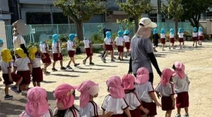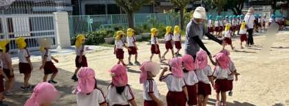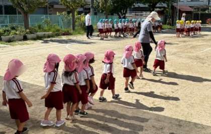 開会式の入場も、5歳児から始まります。その姿を見て、4歳児、3歳児がまっすぐ歩くことや並ぶことなどを学んでいます。かっこいい空組さんみたいにやってみたい、自分もできる、その経験の積み重ねを大切にしています。