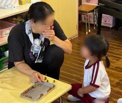 ドングリ 公開日 2024/10/16 更新日 2024/10/16 幼稚園日記 お友達が持って来てくれたドングリ。振ったら小さな音が聞こえることに気づきました。思わず先生に、聞いて、何か音がするよ、とお知らせしました。本当だね、可愛い小さな音が聞こえるね、と受け止められて、思わずニッコリ。クラスのみんなも、興味津々、覗き込んでいました。 いいね(0)