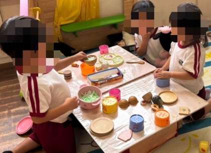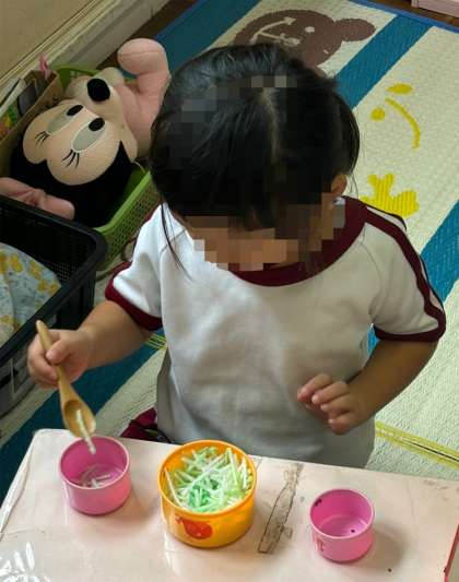 桃組で、突然、果物を包むネットを一人二人とちぎり始め、ラーメンづくりが始まりました。その姿を見て、また一人、ほぼ全員が黙々と真剣につくっていました。できた麺をままごとコーナーに持って行き、一緒に「いただきます」友達同士で楽しい遊びを考え、関わっている桃組です。